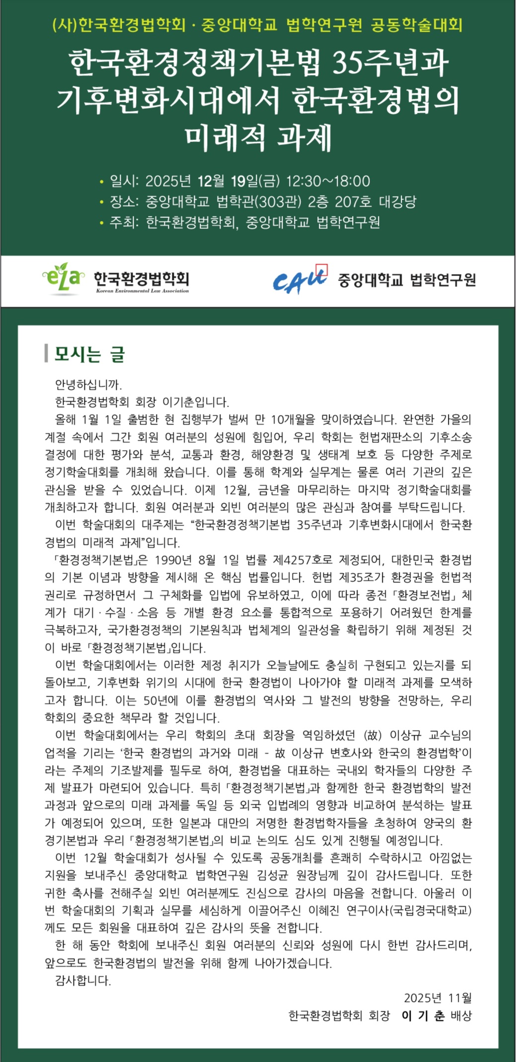 (사)한국환경법학회·중앙대학교 법학연구원 공동학술대회(12.19.)